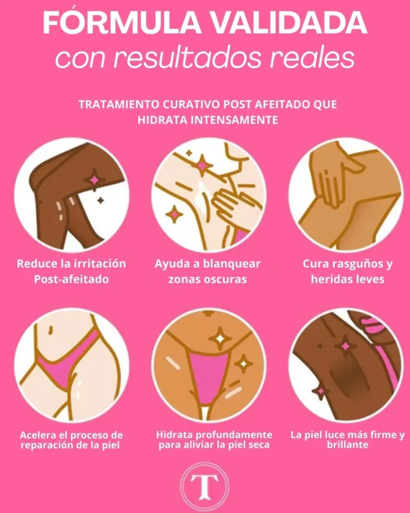 Desde la primera aplicación sentirás la piel más calmada e hidratada. Con el uso continuo notarás menos rojeces, una textura más suave y reducción de vellos encarnados.