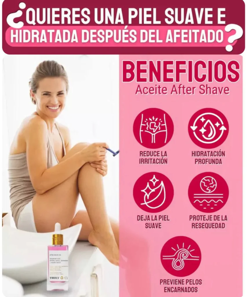 Este aceite está diseñado para usar después del afeitado o depilación. Calma la irritación, blanquea, hidrata profundamente, previene vellos encarnados y deja la piel suave, luminosa y con un delicado aroma a fresa y vainilla.